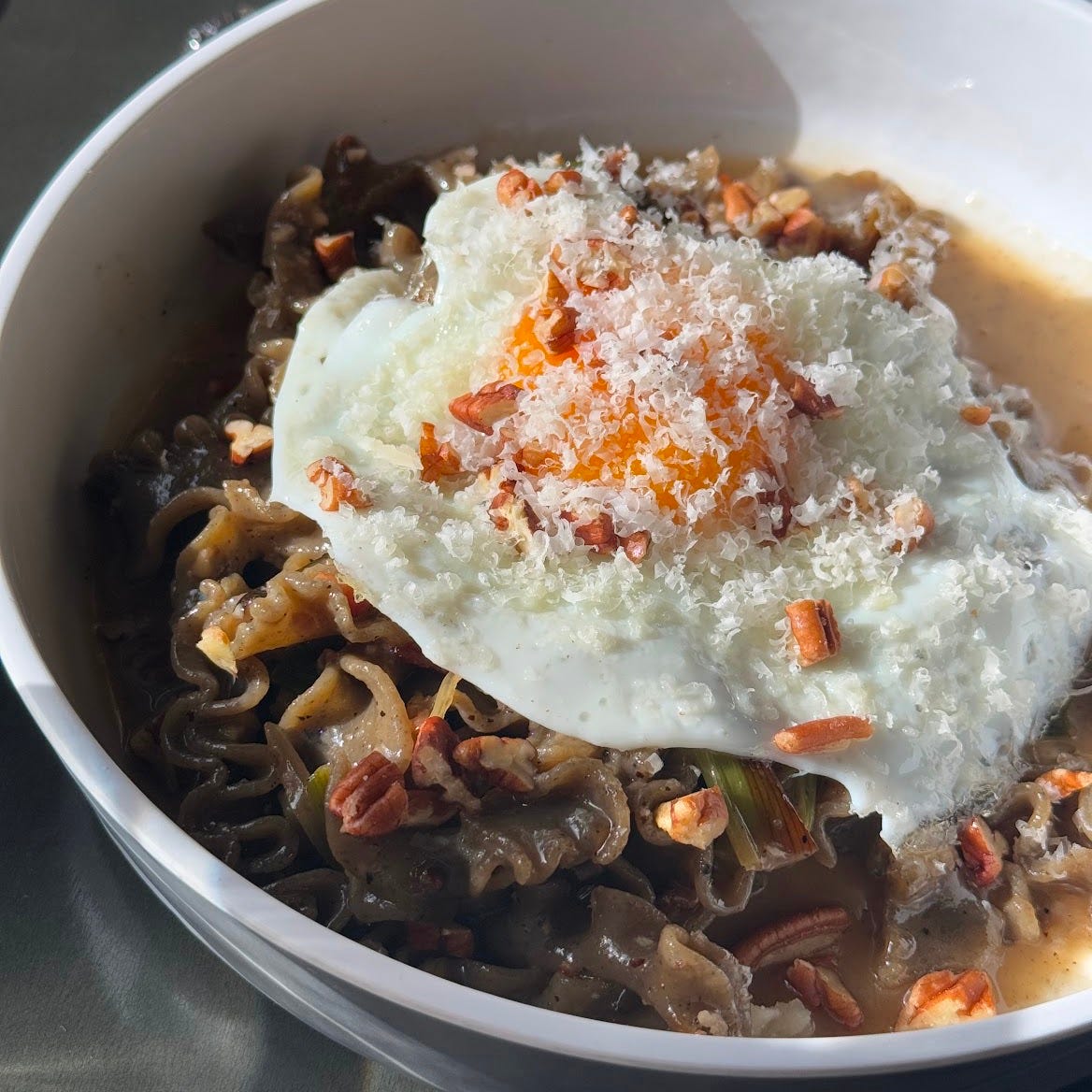 Divide the pasta between two bowls. Top each portion with half the toasted pecans, half the remaining ¼ cup parmesan, half the chives, and an egg.